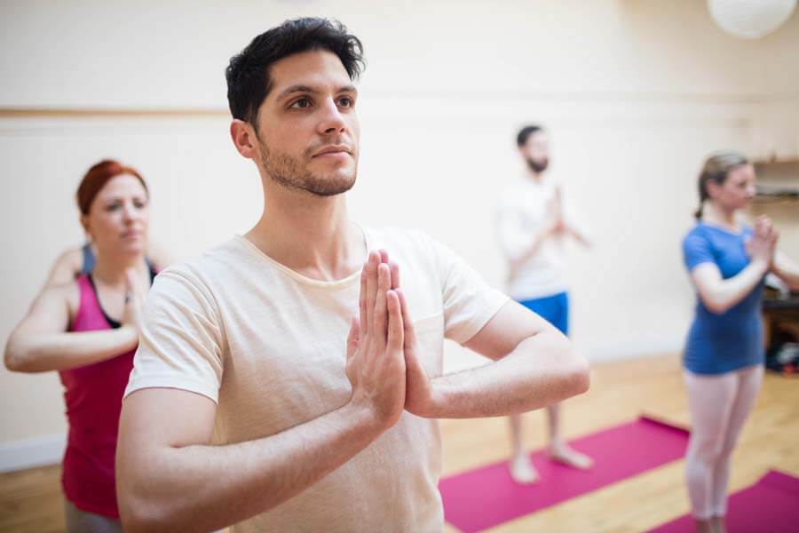Group of people performing tree-pose yoga exercise in the fitness studio